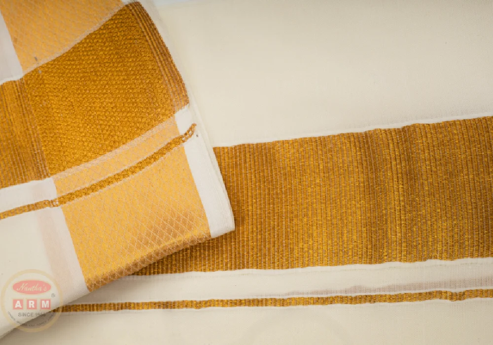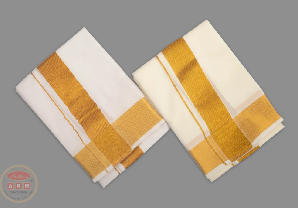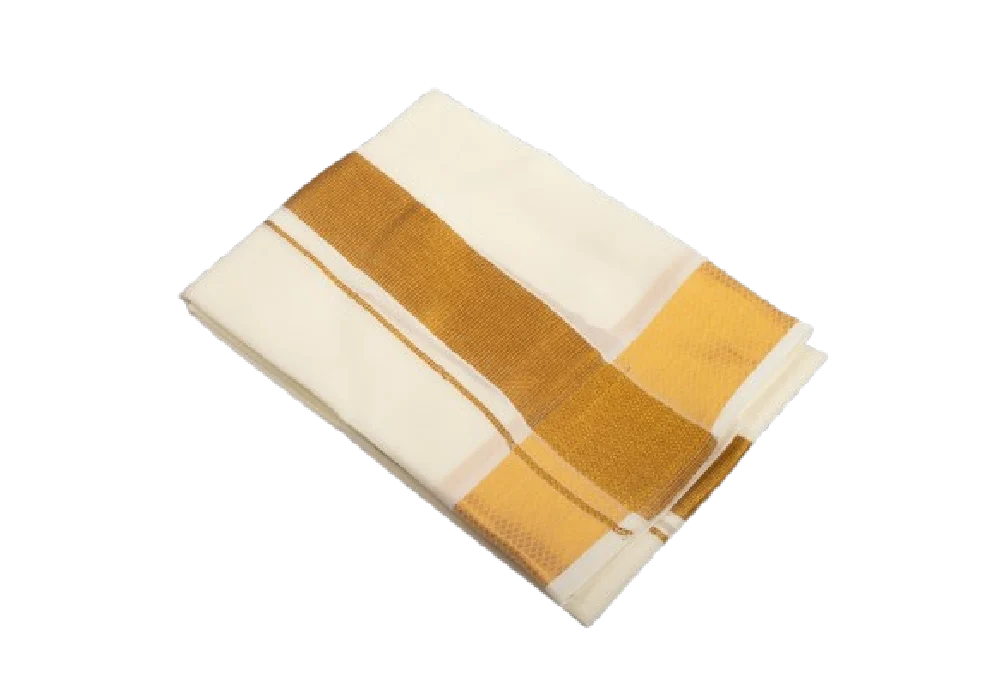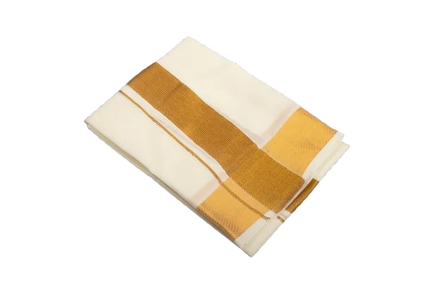 Perfect towel to pair up with traditional gold jari border dhoties. Long, crisp, highly durable with premium blended cotton mix fabric. Gives a rich refined and divine look with its traditional gold jari border.
